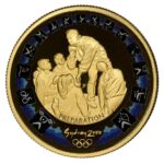 Struck in 10 grams of .9999 fine gold, this Perth Mint proof commemorates the Sydney 2000 Games. The obverse features the Ian Rank-Broadley effigy of Queen Elizabeth II. The reverse depicts the “Preparation” theme, showing a veteran coach demonstrating shot put technique to young athletes. This central scene is encircled by a striking colorised blue border which intricately links 15 official Olympic pictograms.