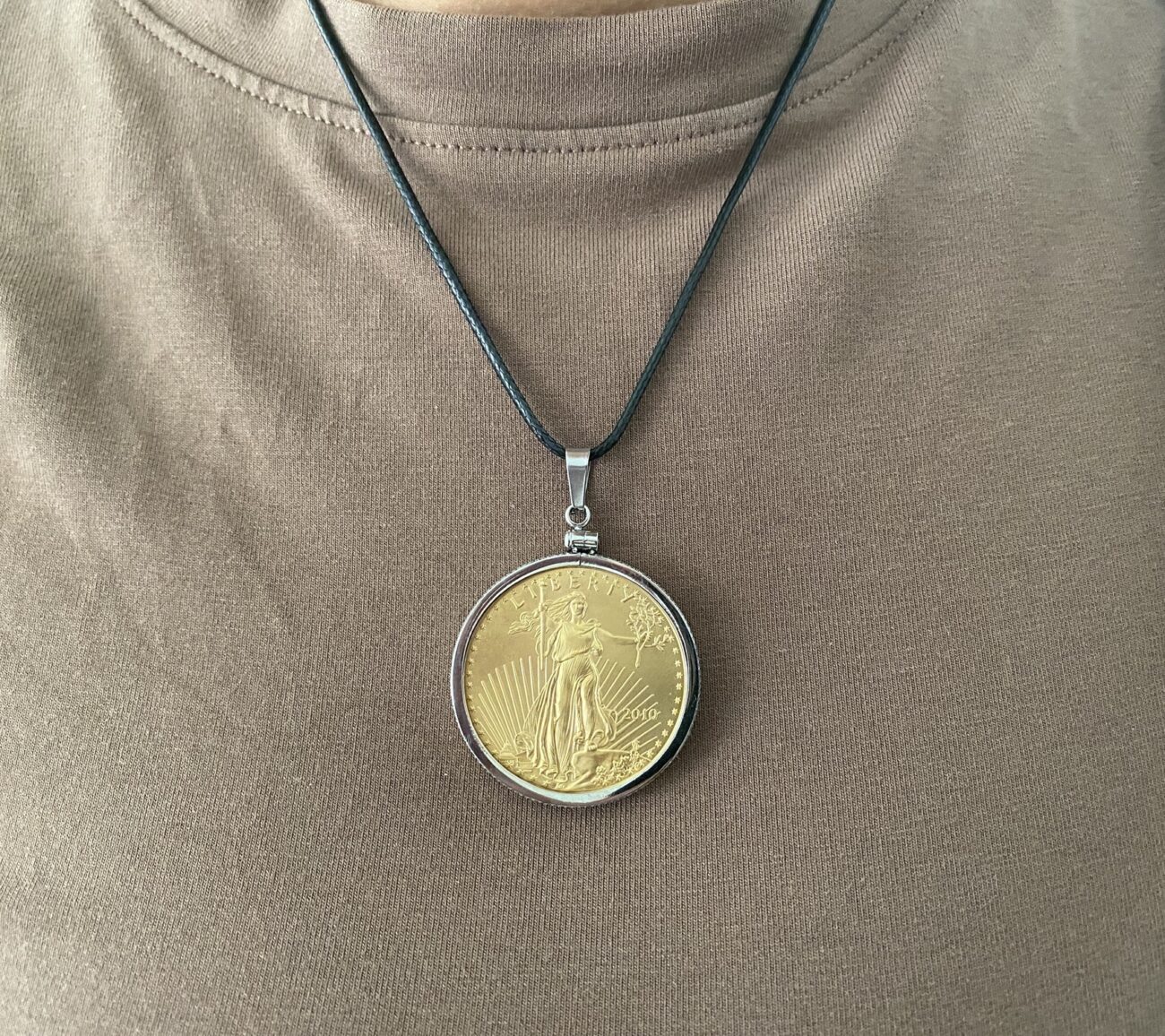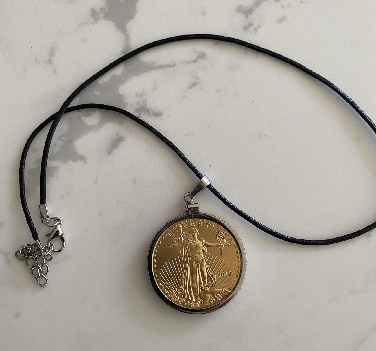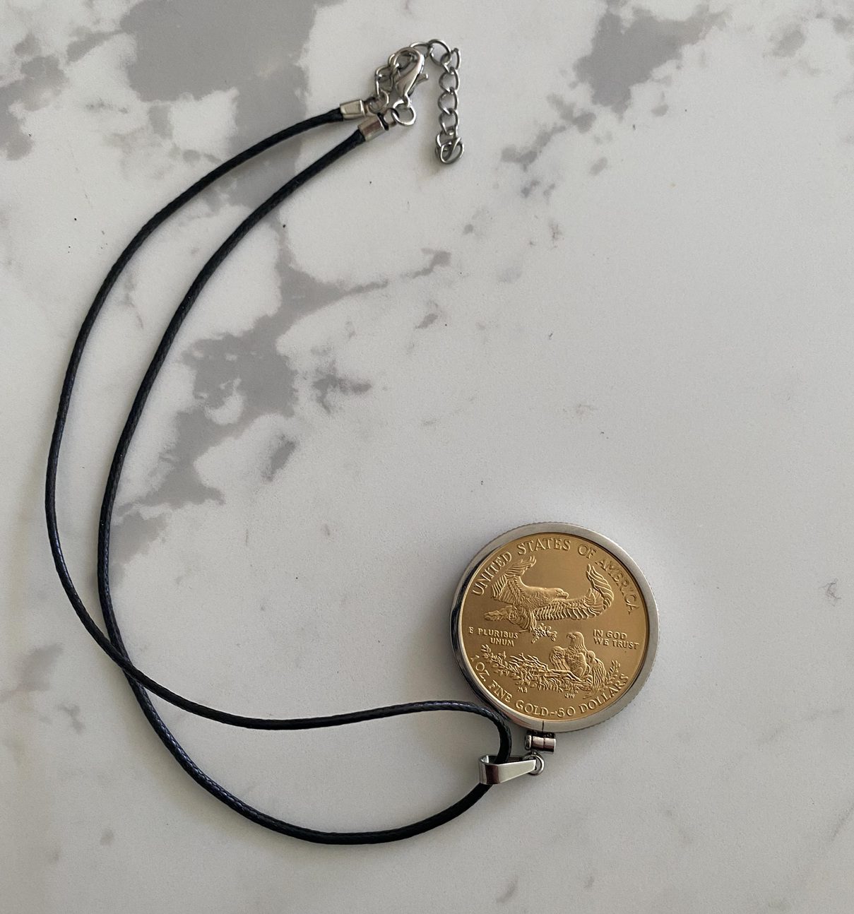Hi stackers! This listing is for my 1 oz Gold American Eagle Coin in excellent condition mounted in a stainless steel screw top bezel. The necklace is made from leather.