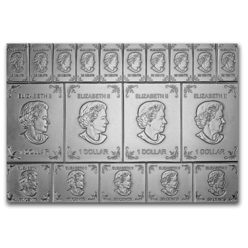 The MapleFlex is a 2 oz silver bullion bar that is divisible. Each individual piece has its own markings of weight, purity, and metal content, as well as individual designs and an assigned face value.